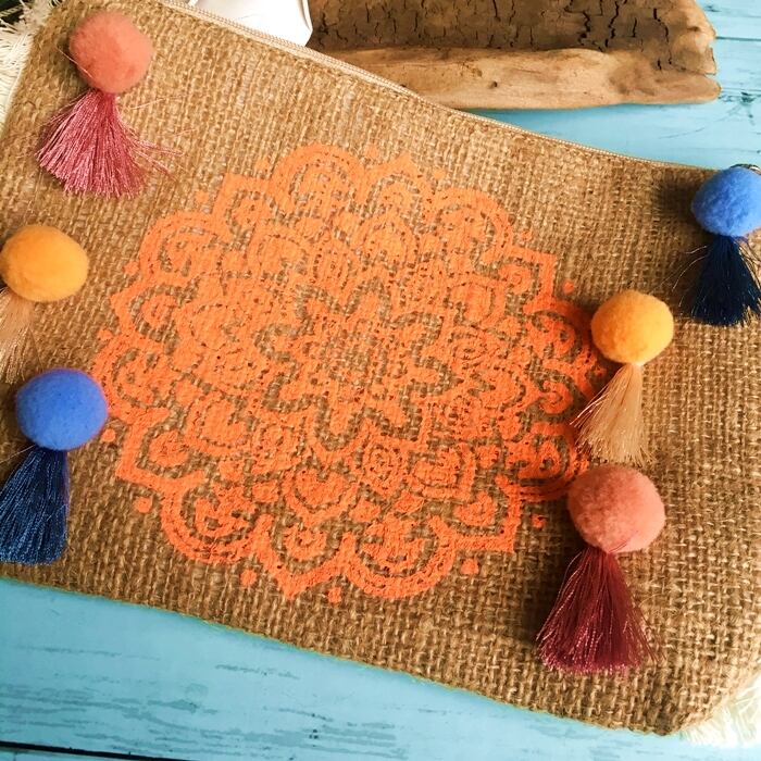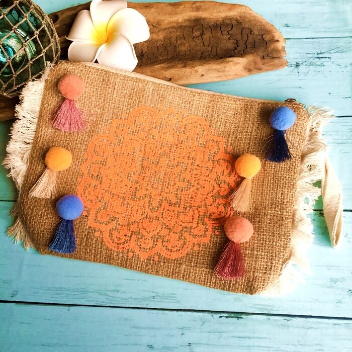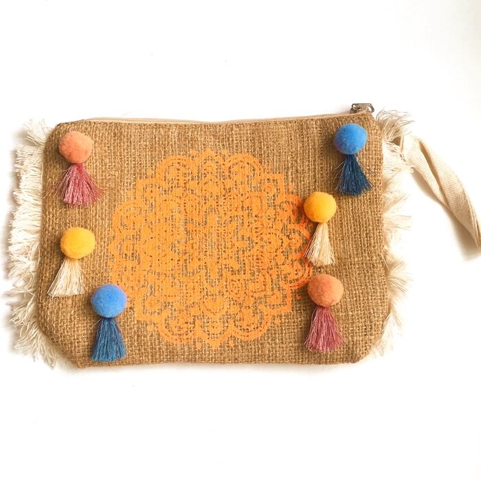 ポンポン&タッセル フリンジ クラッチ(マンダラ柄/オレンジ) ボヘミアン ポーチ【バリ直輸入】