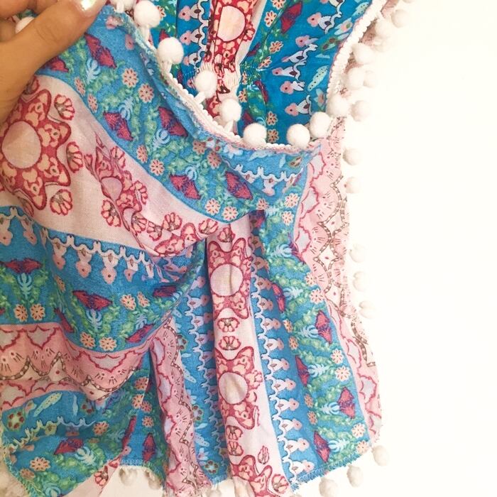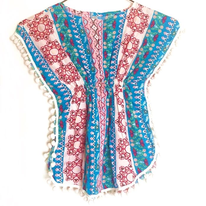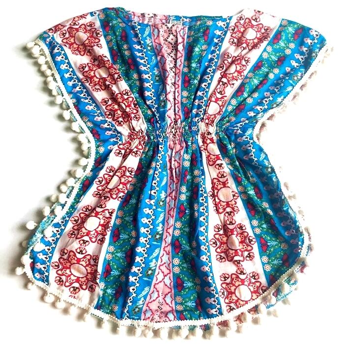 南国風 ポンポン付 チュニック ワンピ (ブルー)100~110cm【バリ直輸入】
