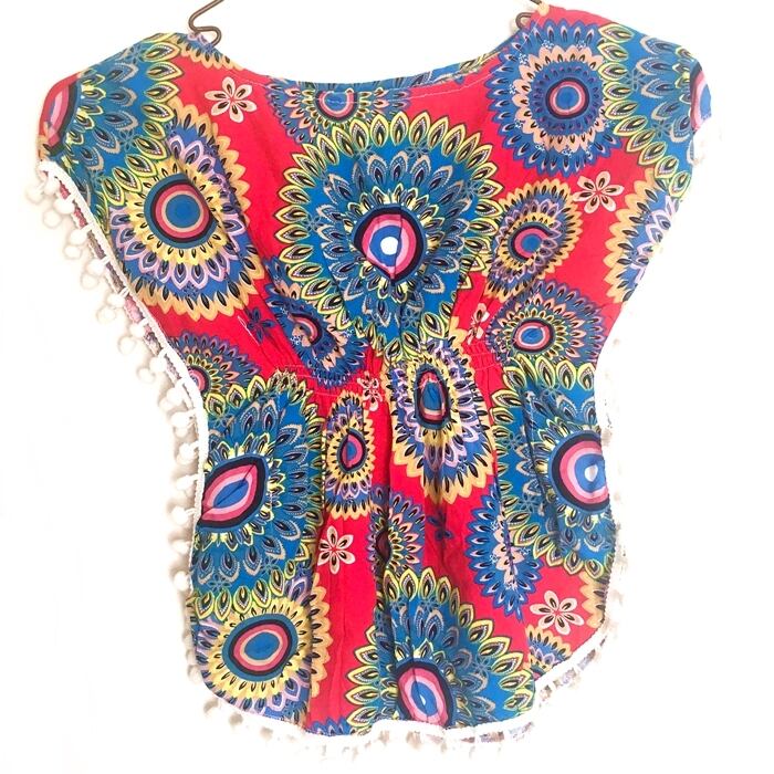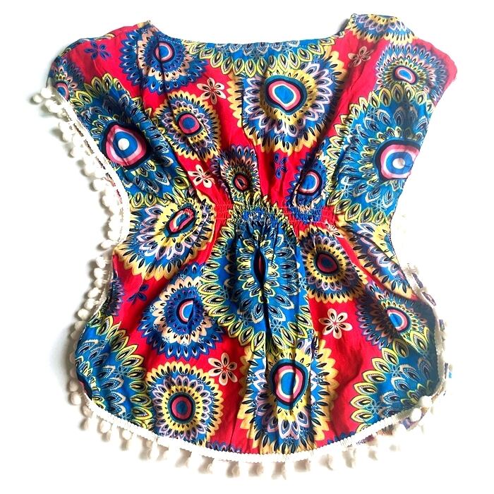 南国風 ポンポン付 チュニック ワンピ (赤)100~110cm【バリ直輸入】