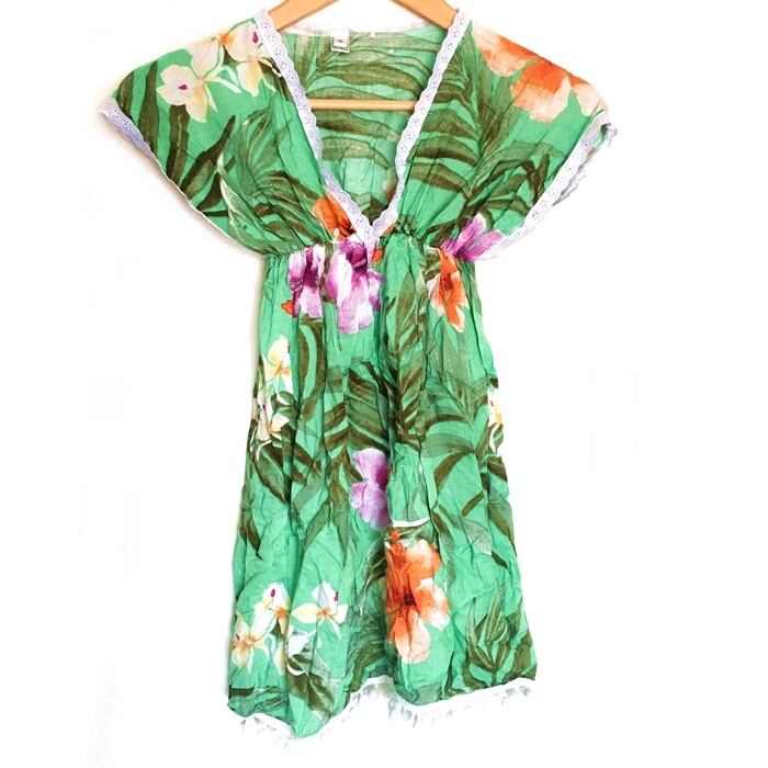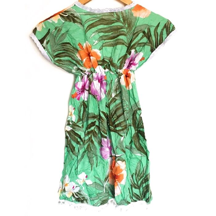 南国風 ポンポン&レース 花柄 ワンピース (グリーン)120~130cm【バリ直輸入】