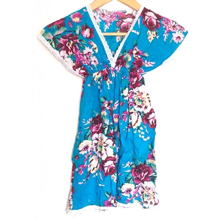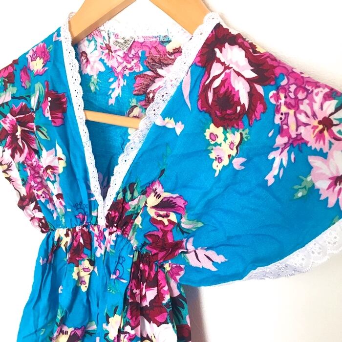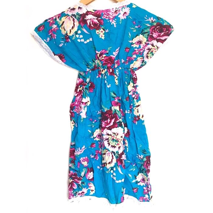 南国風 ポンポン&レース 花柄 ワンピース (ブルー)120~130cm【バリ直輸入】