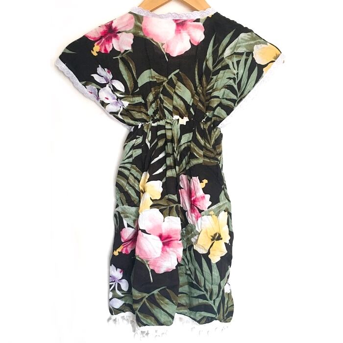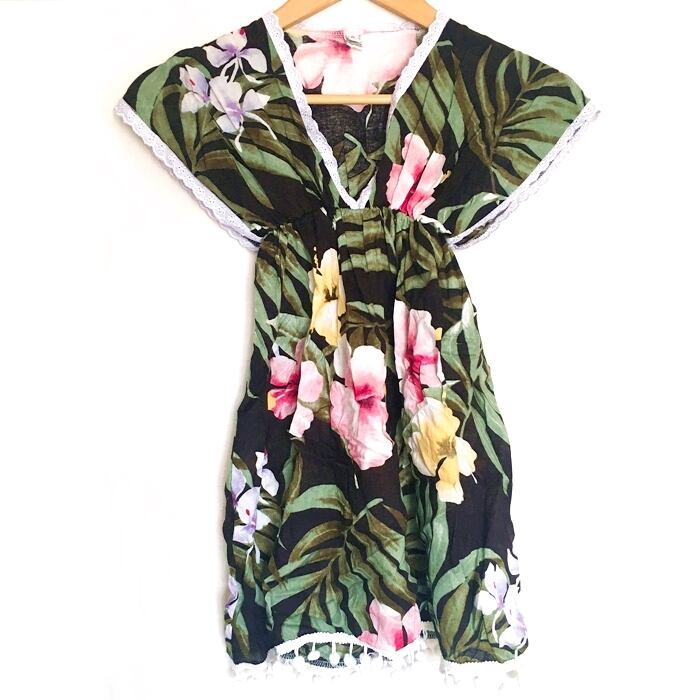 南国風 ポンポン&レース 花柄 ワンピース (黒)120~130cm【バリ直輸入】