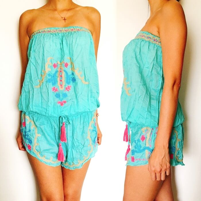 ベアトップ リゾート風 ロンパース(黒×ネオンオレンジ刺繍)タッセル【バリ島直輸入】