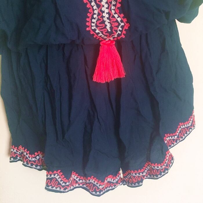 ベアトップ リゾート風 ロンパース(ネイビー×ネオンピンク刺繍)タッセル【バリ島直輸入】