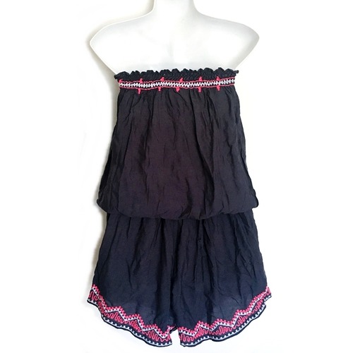 ベアトップ リゾート風 ロンパース(グレー×ネオンピンク刺繍)タッセル【バリ島直輸入】