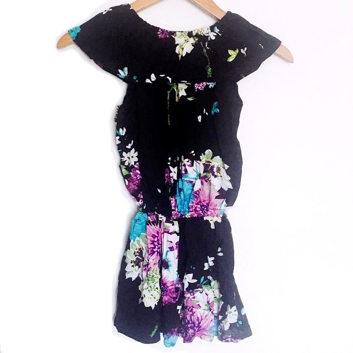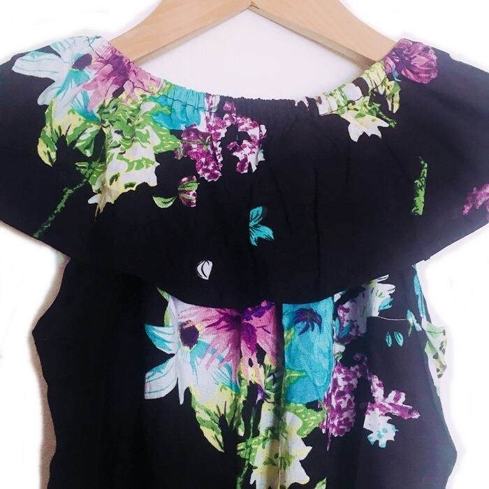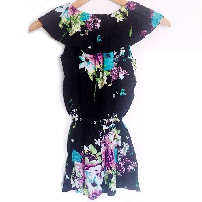 フラワー柄 リゾート オフショルダー ロンパース(ブラック)110~120cm【バリ島直輸入】