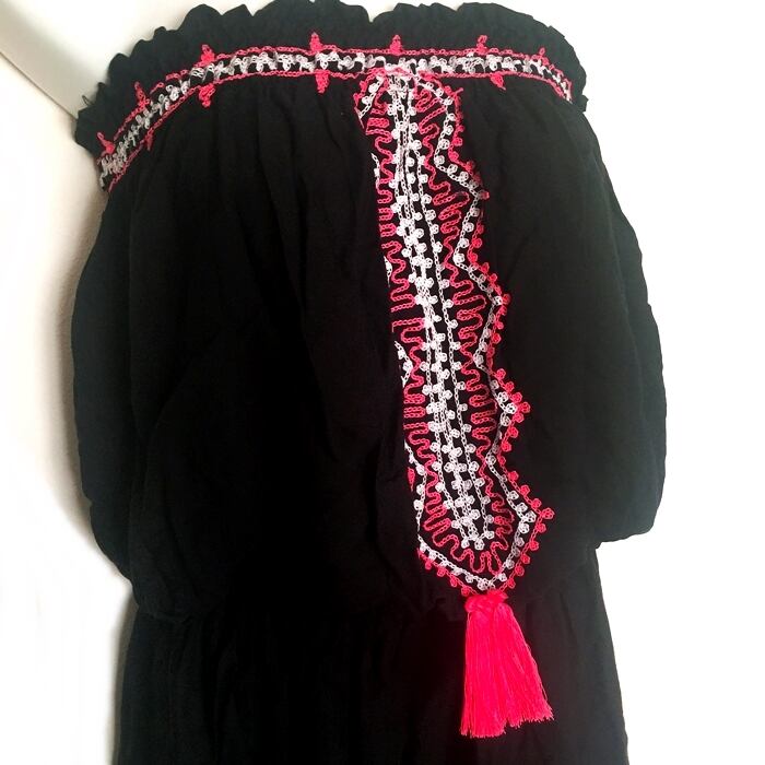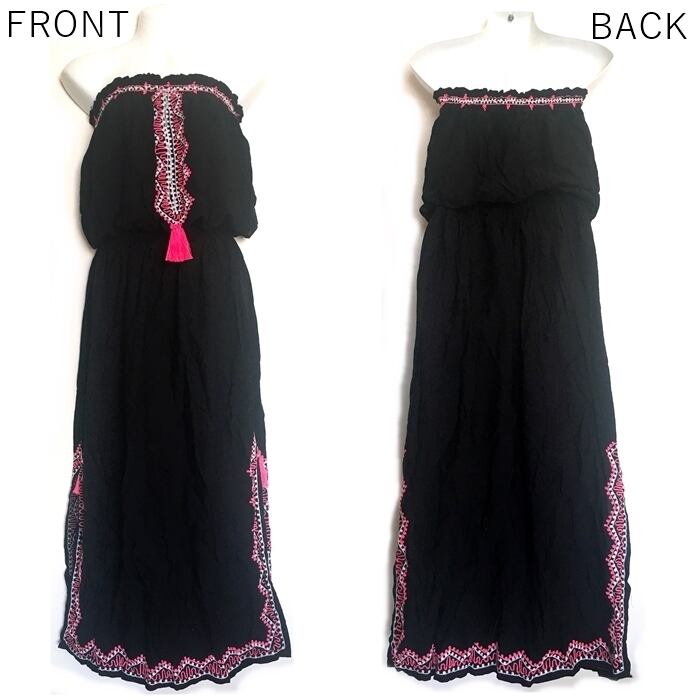 ボヘミアン♡エスニック刺繍 ベアトップ ワンピース (黒×ネオンピンク)【バリ島直輸入】