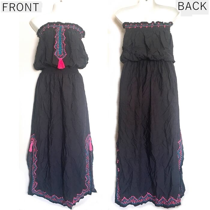 ボヘミアン♡エスニック刺繍 ベアトップ ワンピース (グレー×ネオンピンク)【バリ島直輸入】