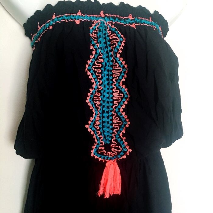 ボヘミアン♡エスニック刺繍 ベアトップ ワンピース (黒×ブルー×ピンク)【バリ島直輸入】