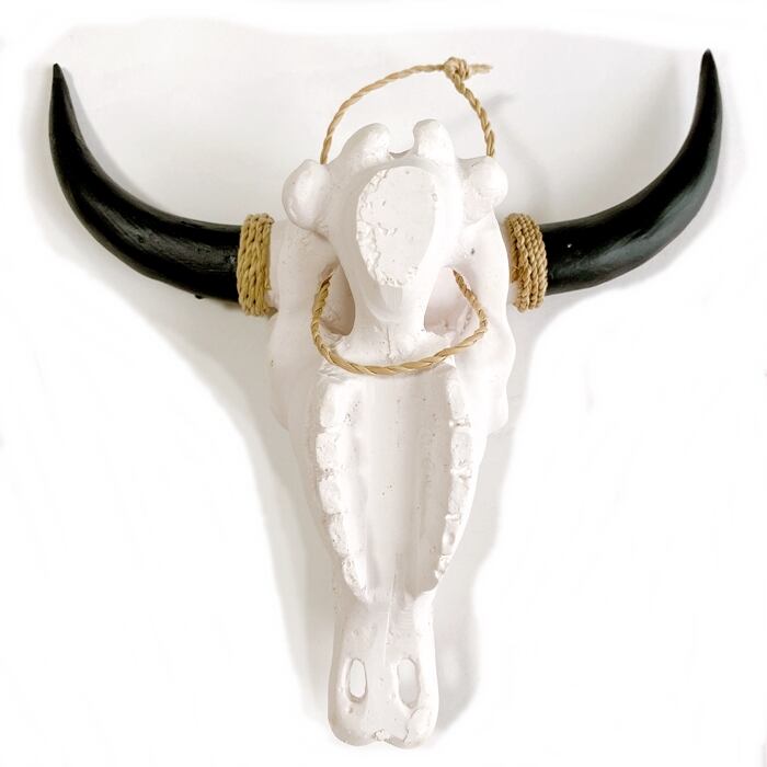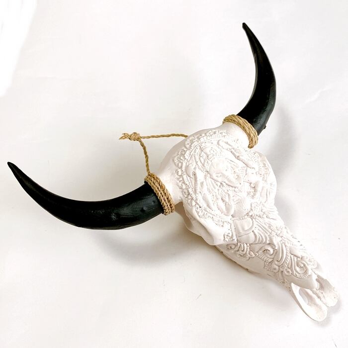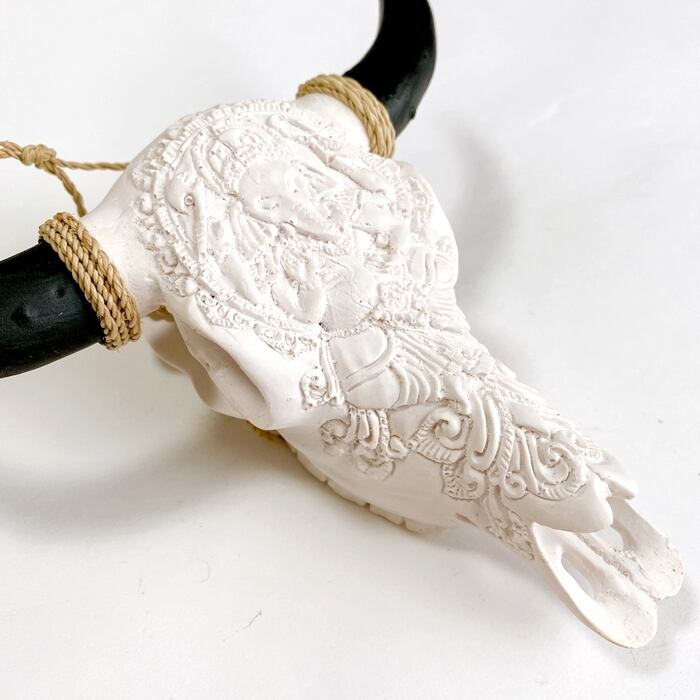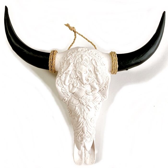 ネイティブアメリカン カウスカル オブジェ牛 骸骨 オブジェ(白×ガネーシャ柄)【バリ直輸入】