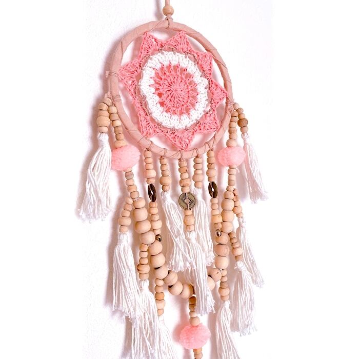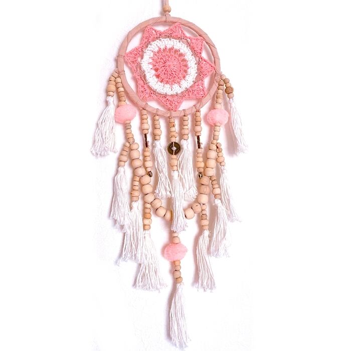 【バリ島直輸入】ネイティブ ドリームキャッチャー(ピンク×クロッシェ×コイン)フェザー