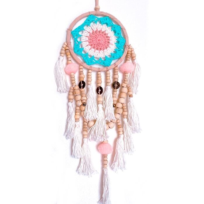 【バリ島直輸入】ネイティブ ドリームキャッチャー(ピンク&ブルー×クロッシェ×コイン)フェザー