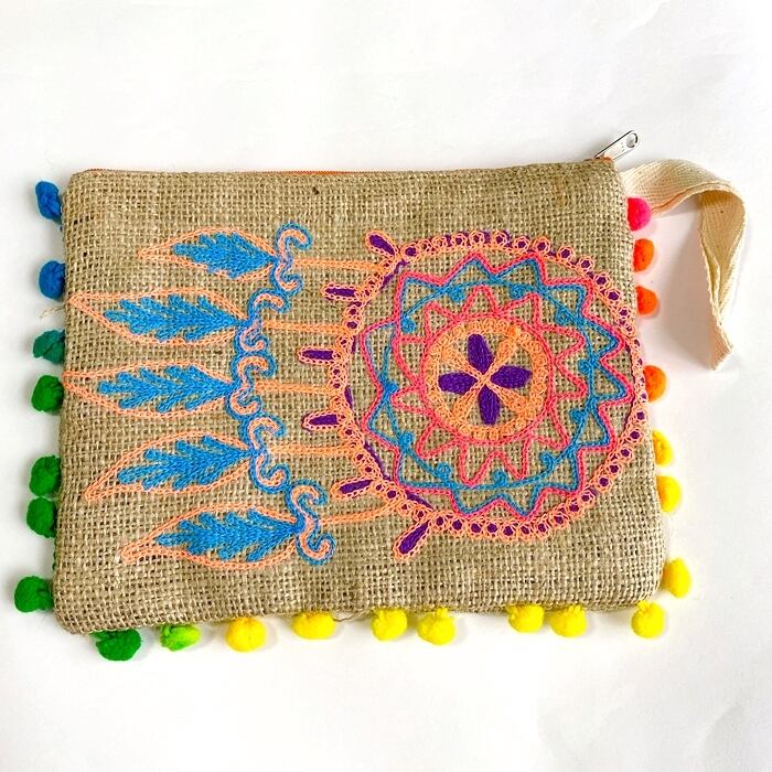 ポンポン フリンジ クラッチ(ドリームキャッチャー刺繍) ボヘミアン ポーチ【バリ直輸入】