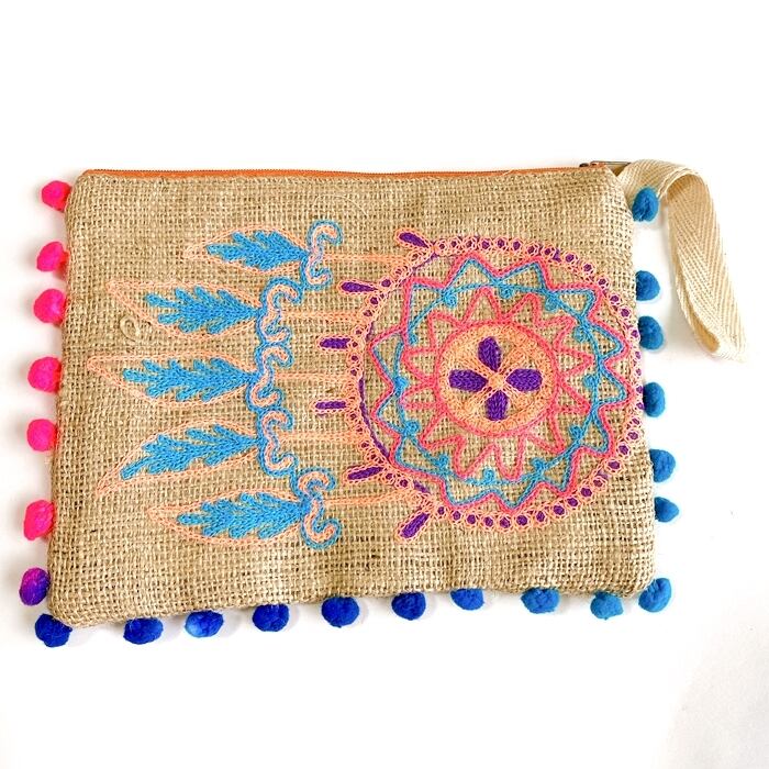 ポンポン フリンジ クラッチ(ドリームキャッチャー柄刺繍) ボヘミアン ポーチ【バリ直輸入】