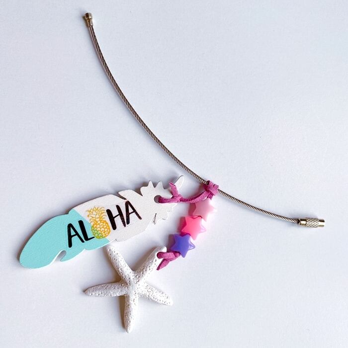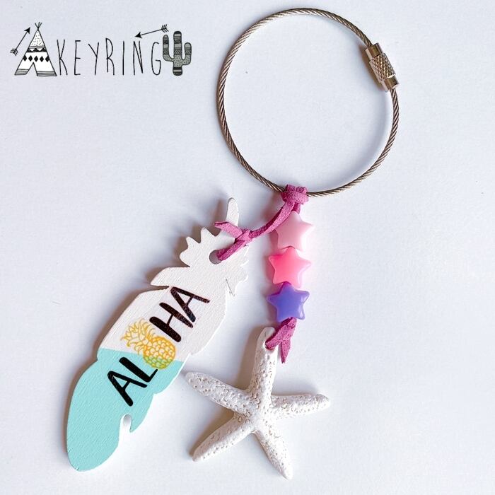 海を感じる ワイヤーキーホルダー ★ ALOHA スターフィッシュ フェザー キーリング